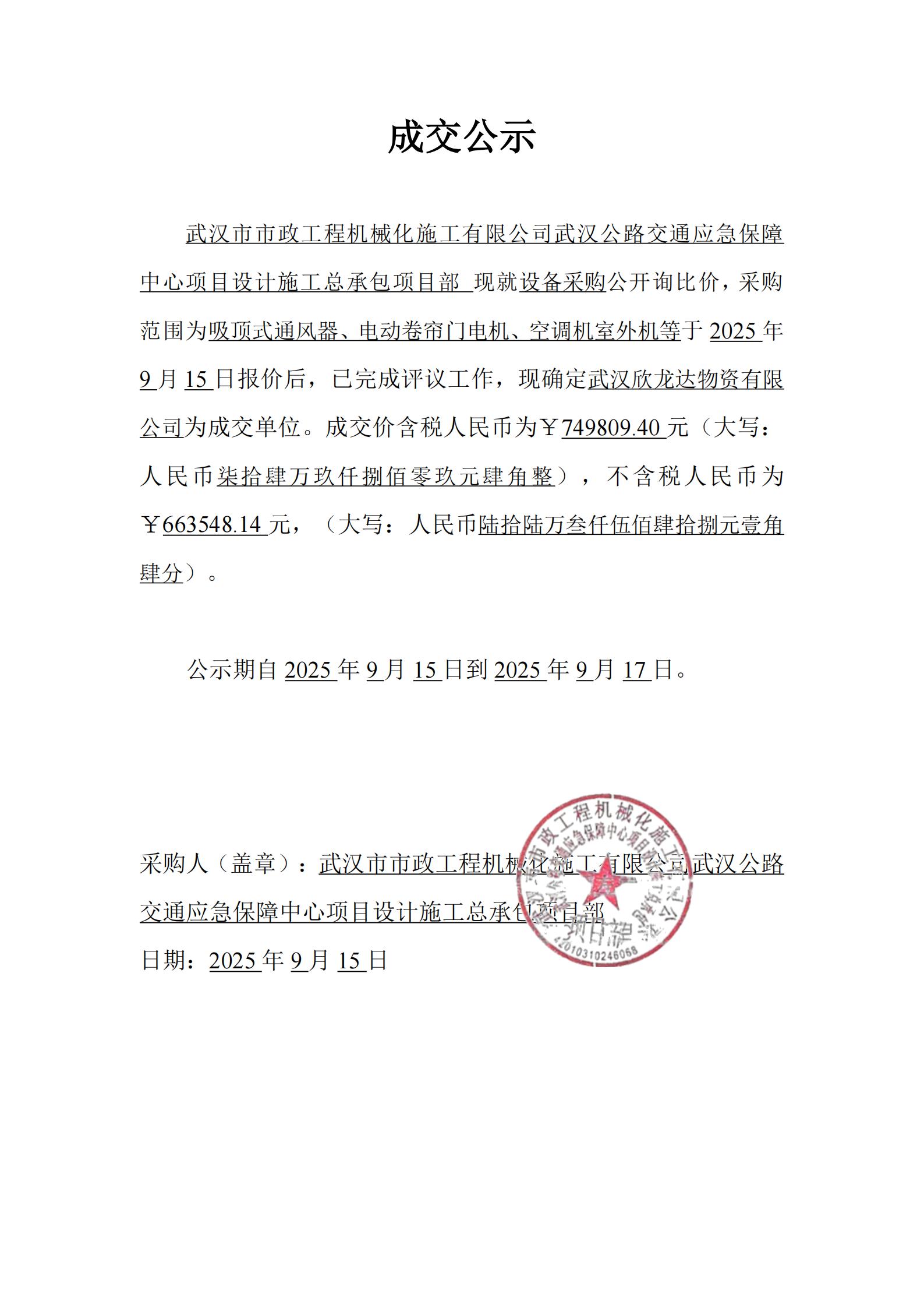 武漢公路交通應急保障中心項目設計施工總承包項目設備采購成交公示