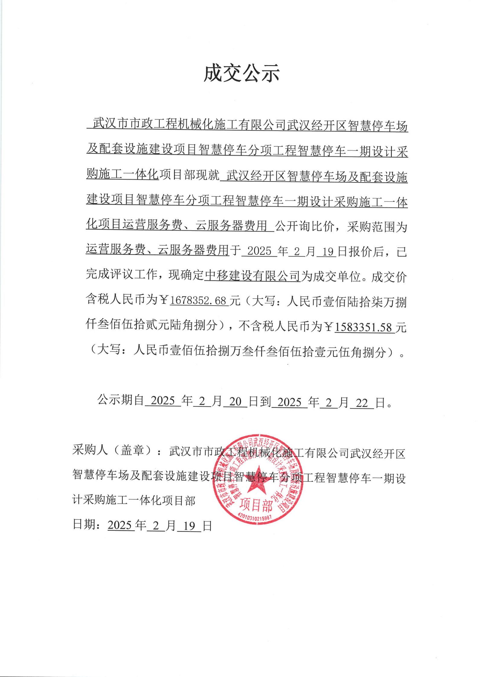 武漢經(jīng)開區(qū)智慧停車場(chǎng)及配套設(shè)施建設(shè)項(xiàng)目智慧停車分項(xiàng)工程智慧停車一期設(shè)計(jì)采購施工一體化項(xiàng)目運(yùn)營服務(wù)費(fèi)、云服務(wù)器費(fèi)用成交公示