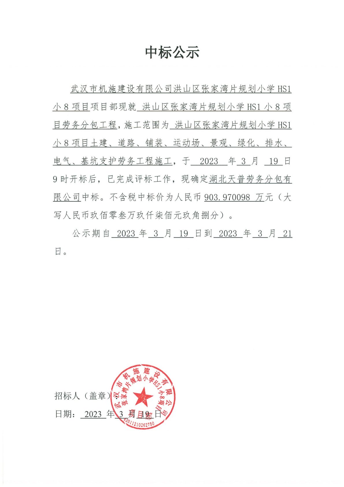 武漢市機(jī)施建設(shè)有限公司洪山區(qū)張家灣片規(guī)劃小學(xué)HS1小8項(xiàng)目勞務(wù)分包工程 中標(biāo)公示