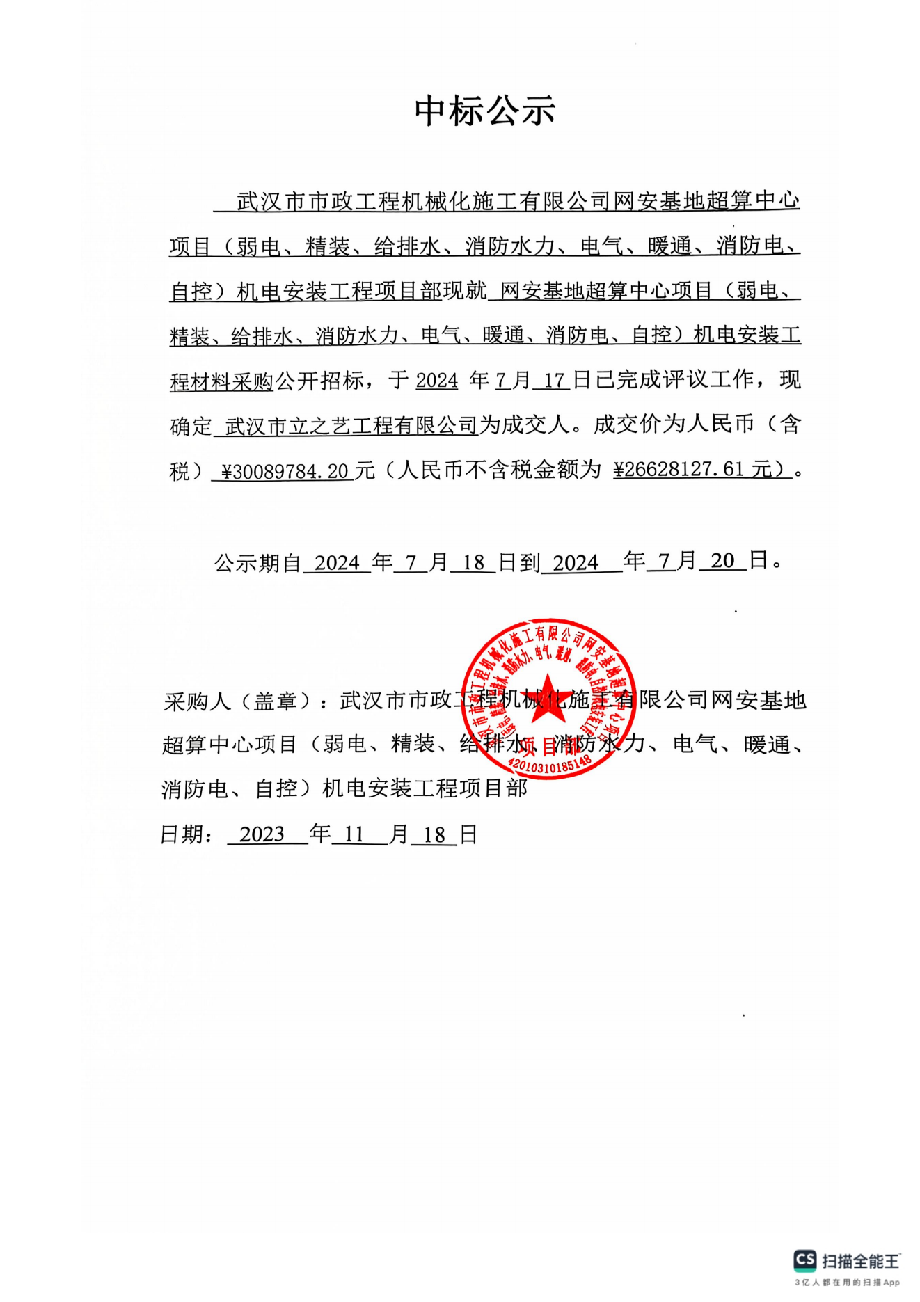 網安基地超算中心項目(弱電、精裝、給排水、消防水力、電氣、暖通、消防電、自控)機電安裝工程-材料采購中標公示