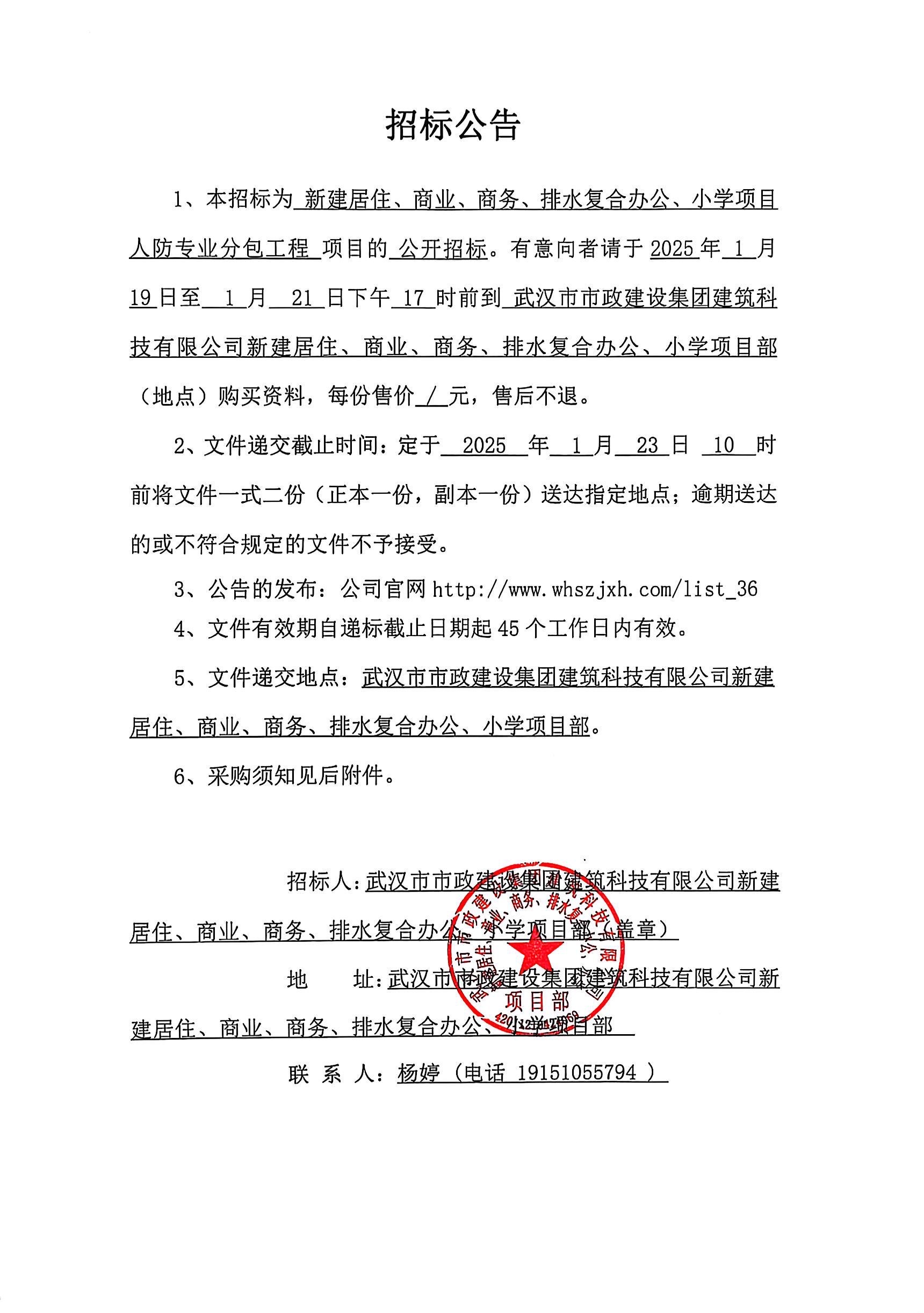 武漢市市政建設(shè)集團(tuán)建筑科技有限公司新建居住、商業(yè)、商務(wù)、排水復(fù)合辦公、小學(xué)項(xiàng)目人防專業(yè)分包工程招標(biāo)公告
