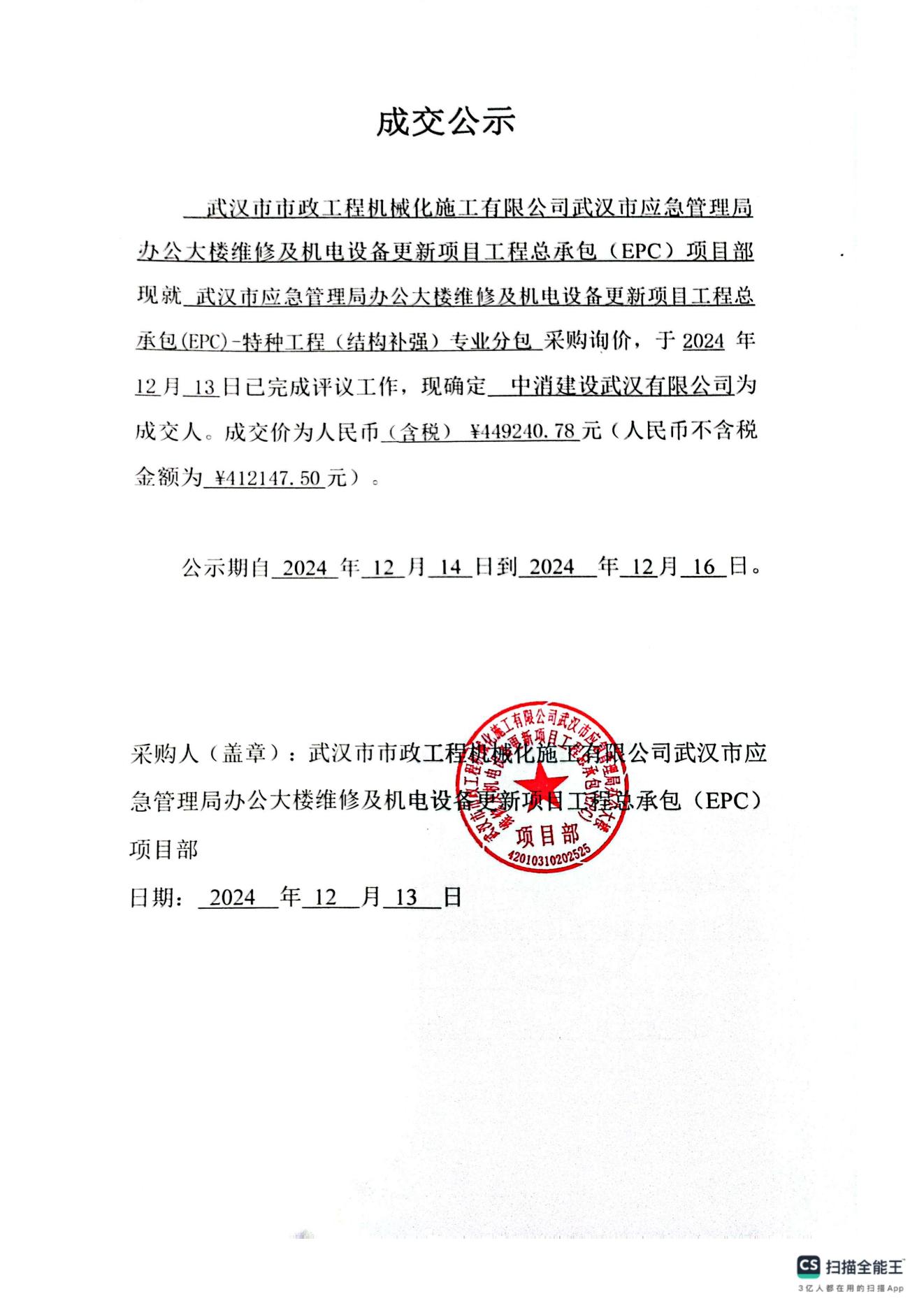 武漢市應急管理局辦公大維修及機電設樓備更新項目工程總承包(EPC) -特種工程(結構補強)專業分包成交公示
